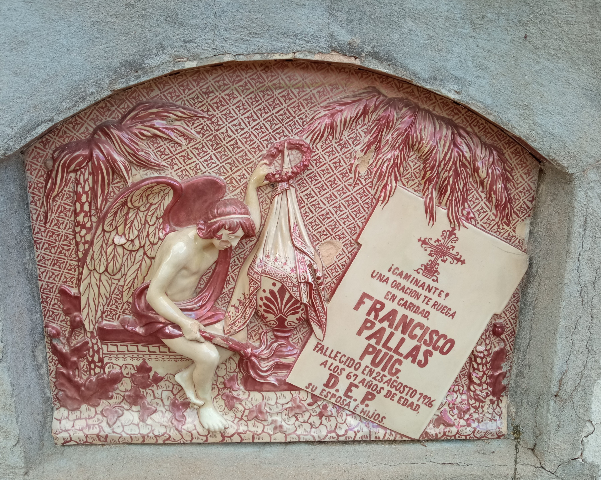 La lápida de Francisco Pallás y Puig en el cementerio de Valbona es una magnífica cerámica de reflejo metálico de La Ceramo, probablemente obra del famoso escultor Antonio Yerro Feltrer. El epitafio lo redactó Francisco Pallás mismo: