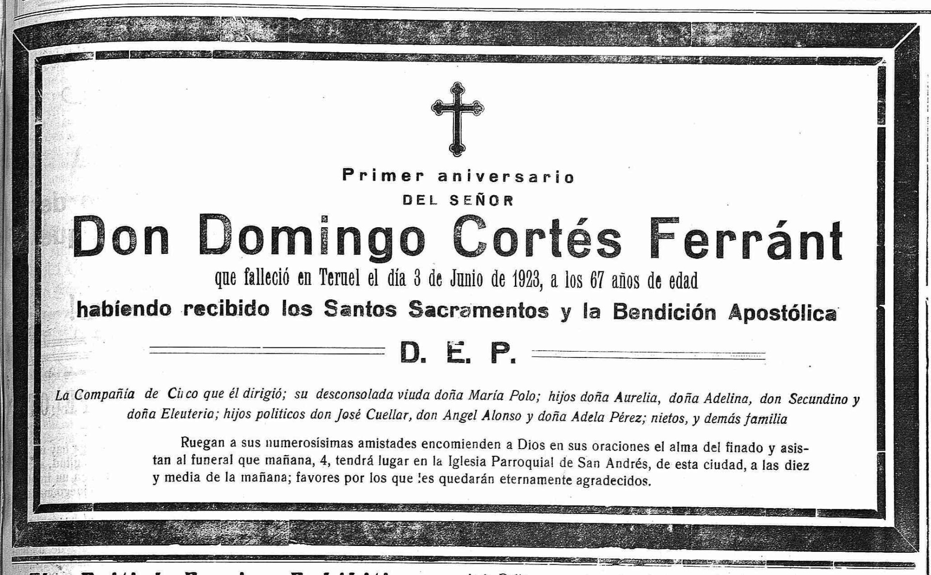 Vuelven en 1923, pero ese fue un mal año para el circo ya que cuando iban a llegar a Teruel, el ayuntamiento no les había dado todavía un lugar para instalarse. Por si fuera poco, el 29 de mayo Domingo fue multado por la guardia civil por pescar en el río de forma clandestina. El 5 de junio fallecerá en Teruel Domingo Cortes a la edad de 63 años. A sus funerales acudió casi toda la ciudad ya que era un hombre muy apreciado. La banda municipal acompaño la conducción del cadáver al cementerio.